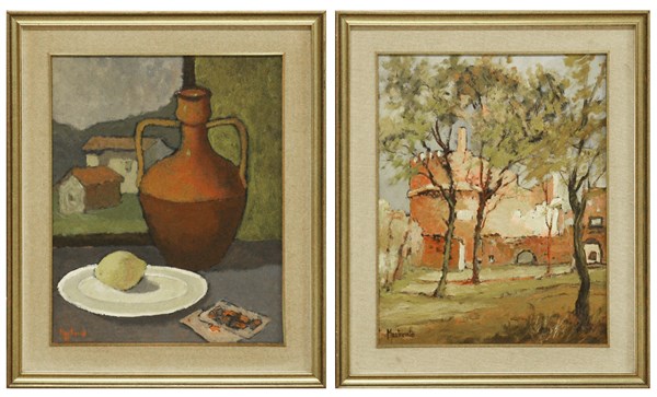 Mastrovito "Scorcio con rovine" e "Natura morta" '69 coppia di dipinti ad olio su tela (cm 50x40) firmati, uno datato, in cornici