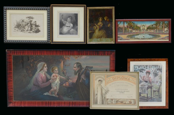 Lotto composto da una cromolitografia, una litografia, un incisione, una stampa su vetro e tre riproduzioni, soggetti e misure diverse, in cornici (difetti)