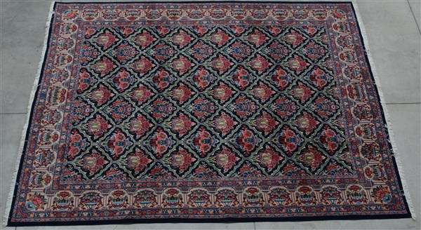 Decoro a giardino con ogive romboidali polilobate verdi contenenti mazzi di fiori su fondo blu notte. Bordura con vasi fioriti su fondo nocciola. (cm 280x223) (difetti)