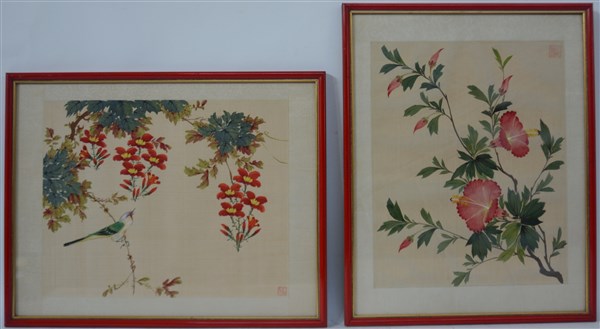 Coppia di stampe a colori su seta raffiguranti fiori (cm 35x45)
