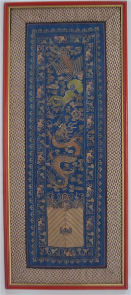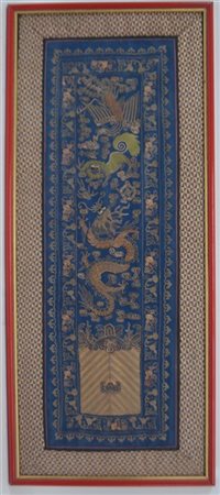 Ricamo in fili di metallo dorato applicati su raso di seta blu. Decoro con drago, araba fenice e cane di Fo. Cina, inizio secolo XX (in cornice) (cm 72x31)