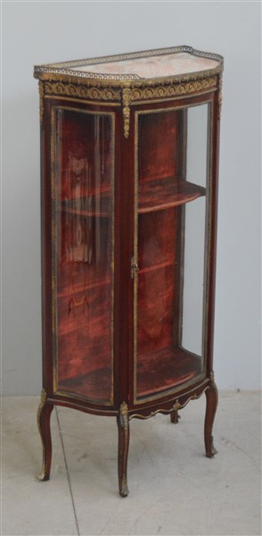 Piccola vetrina in mogano con vetri bombati, gambe mosse, guarnizioni in bronzo e metallo, piano in marmo. Francia, fine secolo XIX (cm 68x141x32) (lievi difetti)