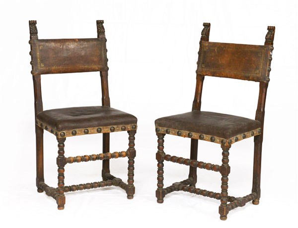 Lot 742 | Coppia di sedie in noce stile rinascimentale, con gambe e traverse tornite rive