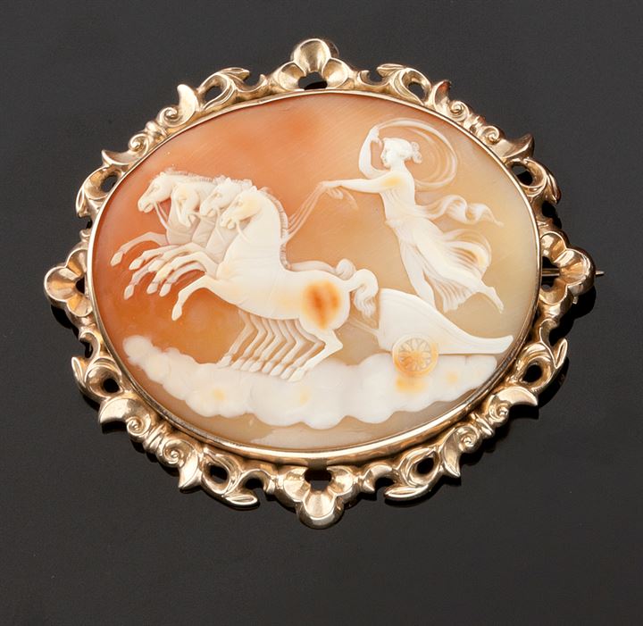 Lot 568 | SPILLA Spilla in oro giallo recante un cammeo raffigurante una biga trainata...