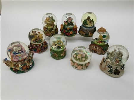 Gruppo di nove boules de neige di soggetti differenti di cui sei con carillon. Vetro e resina policroma (h max cm 15) (difetti)