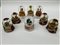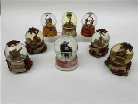 Gruppo di otto carillon boules de neige con strumenti musicali (h max cm 16) (difetti)