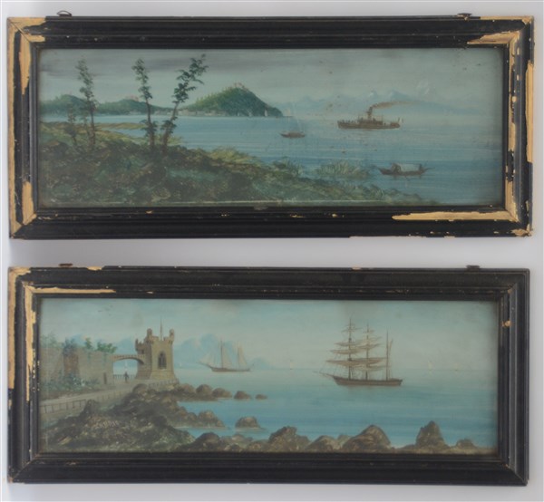 AA.VV. Coppia di dipinti ad olio su lastra metallica raffiguranti "Scorci marini" (cm 17x50) In cornici (difetti)