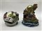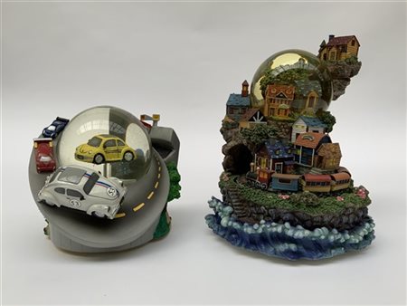 Lotto composto da un carillon Disney con snow globe e il maggiolino Herbie, e un carillon con trenino. Vetro e resina policroma (h max cm 25) (difetti)