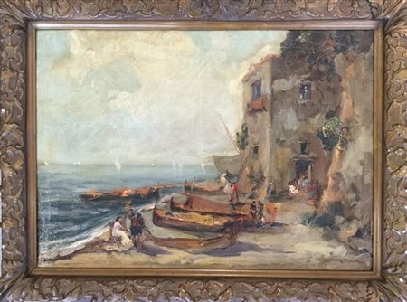 Firma indecifrata "Barche" olio su tela (cm 36x50) Firmato in basso a destra. In cornice (difetti)