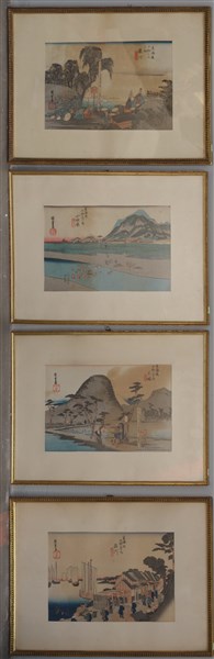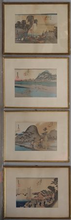 Arte giapponese, lotto di quattro stampe a colori raffiguranti paesaggi e figur