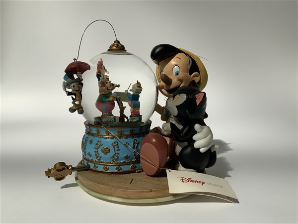 Carillon Disney con snow globe a tema "Pinocchio". Vetro e resina policroma (h max cm 22) (lievi difetti)