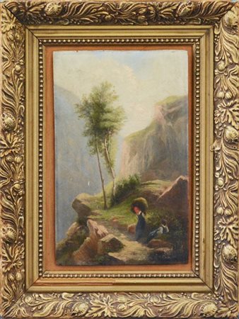 Ignoto del XX Secolo "Paesaggio alpestre con figure" olio su tavola (cm 27x17) Tracce di firma in basso a destra. In cornice