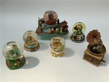 Lotto di cinque boules de neige di soggetti differenti e una composizione artig