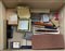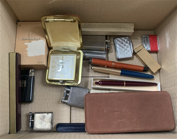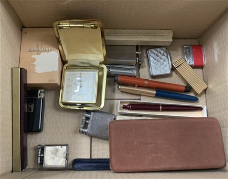 Cartone contenente accendini, penne e due orologi da tavolo (difetti)