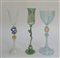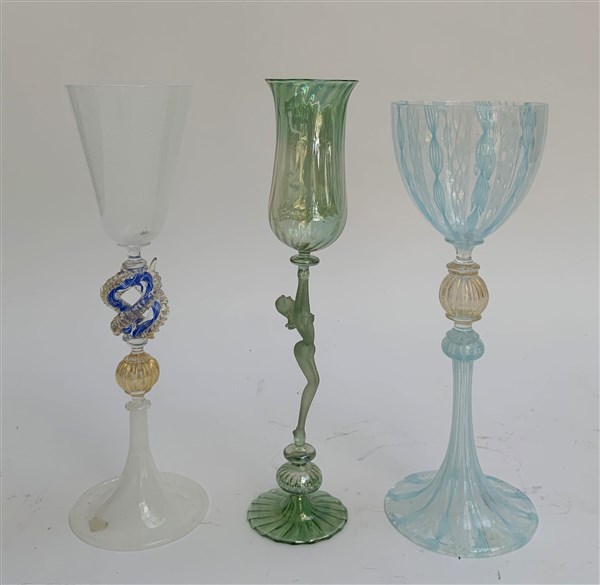 Manifattura di Murano, lotto composto da tre calici in vetro soffiato, una firm
