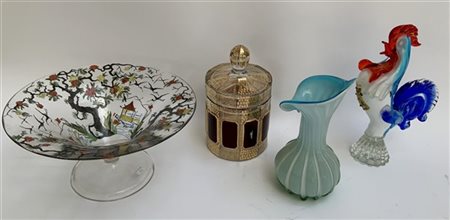 Manifatture diverse lotto composto da un'alzatina, una scatola, un vaso e un gallo in vetro e cristallo (difetti e mancanze)