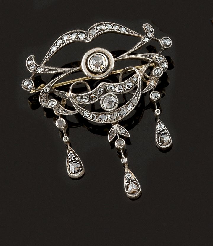 Spilla ciondolo, inizi XX secolo, in oro ed argento, lavorata a motivo vegetale interamente in diamanti taglio brillante di vecchio taglio