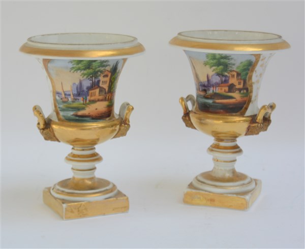Manifattura francese, coppia di vasi biansati in porcellana con filettature dorate, dipinti con paesaggi lacustri e fiori. Secolo XIX (h cm 21) (difetti)