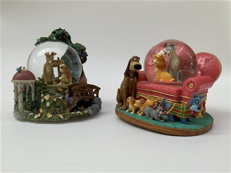 Due carillon Disney con snow globe a tema "Lilli e il vagabondo". Vetro e resina policroma (h max cm 19) (lievi difetti)