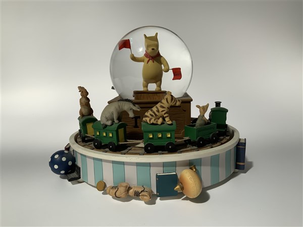 Carillon Disney con snow globe a tema "Winnie the Pooh" con trenino. Vetro e resina policroma (h max cm 21) (difetti)