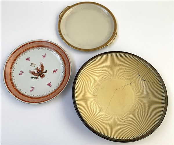Lotto composto da una fiasca in terracotta, un centrotavola scanalato, una piastrella in cornice incisa "Baldelli", un vassoio ed un piatto in porcellana (difetti e vecchi restauri)