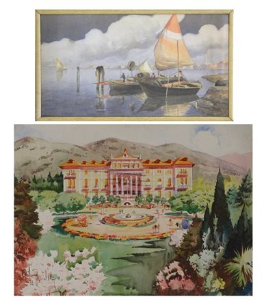Lotto di due acquarelli raffiguranti "Scorcio con barche" e "Scorcio di villa",
