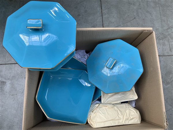 Cartone contenente una parte di servizio da tavola in ceramica blu (lievi difetti)