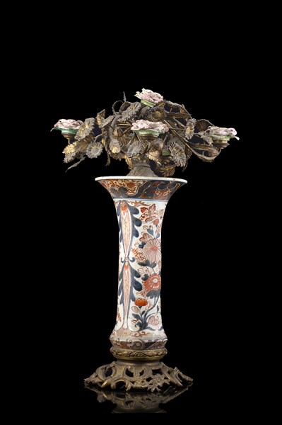 Vaso a tromba in porcellana a decoro Imari montato a candeliere in bronzo dorat