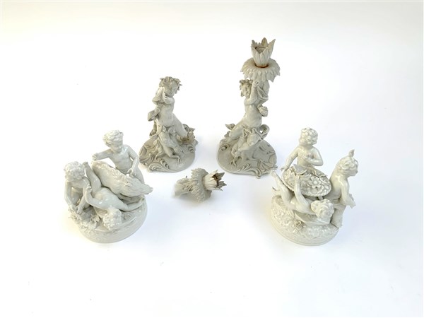 Lotto composto da una coppia di gruppi in porcellana bianca raffiguranti amorini giocosi con fiori e cinghiale e una coppia di candelieri con fusti raffiguranti fanciulli (h max cm 26) (difetti e restauri)