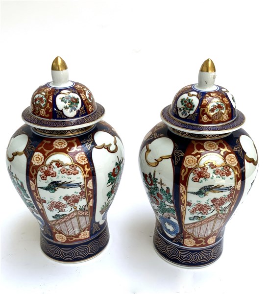Coppia di vasi a potiche con coperchio in porcellana decorata in policromia Gia