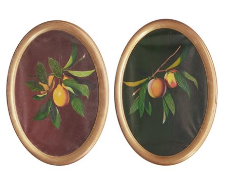 Ignoto "Rami con frutta" coppia di dipinti ad olio su tela ovale (cm 70x50) fir