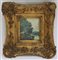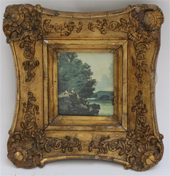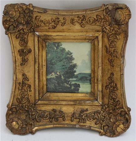 Lotto di due cornici in legno e pastiglia dorata contenenti una riproduzione e