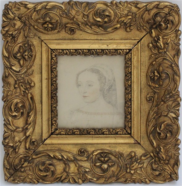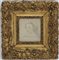 Lotto di due cornici in legno e pastiglia dorata contenenti una riproduzione e un disegno di dama (difetti e mancanze)