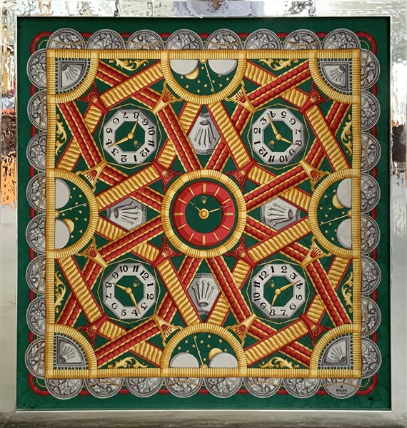 ROLEX Foulard in seta nei toni del rosso verde e oro decorato con quadranti di