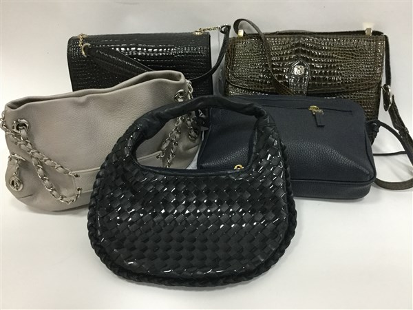 Lotto di cinque borse a spalla con tracolla in pelle di diversi colori, materiali e modelli (difetti e segni d'uso)
