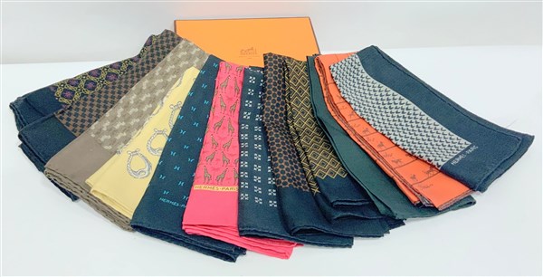 Lotto composto da dodici mini carré in seta, utilizzabili anche come pochette da uomo, in vari colori e fantasie prevalentemente in colori scuri e una scatola (cm 40x40) (difetti e segni d'uso)