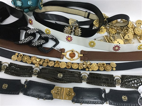 Lotto composto da tredici cinture in cuoio e camoscio di vari colori e fatture, di cui quattro a catena in metallo color oro (difetti e mancanze)