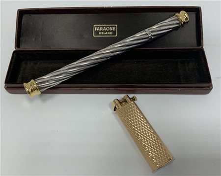 Lotto composto da un accendino placcato oro e un involucro per penna in argento con scatola originale Faraone