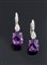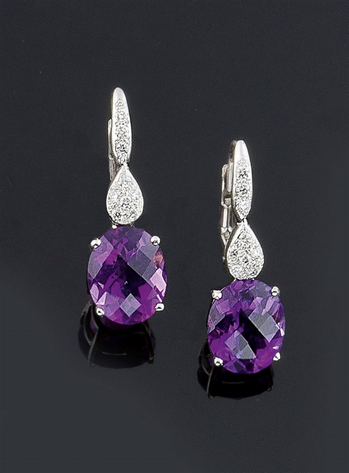 Coppia di orecchini pendenti in oro bianco, con due ametiste taglio ovale sormontate da elemento rigido in diamanti taglio brillante per complessivi ct 0,35 ca