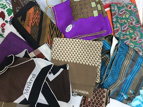 Lotto di circa cinquanta tra foulard, sciarpine e fazzoletti, in chiffon, seta, cotone e polyester di diversi colori e dimensioni (difetti e segni d'uso)