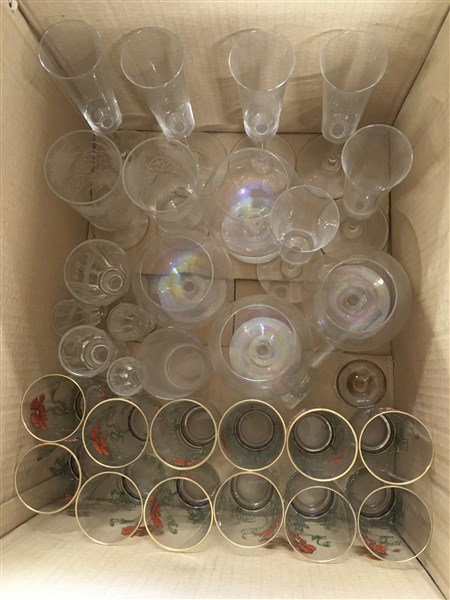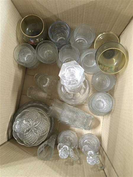 Due cartoni contenenti numerosi bicchieri di forma e decoro diverso ed altri oggetti in vetro (difetti)
