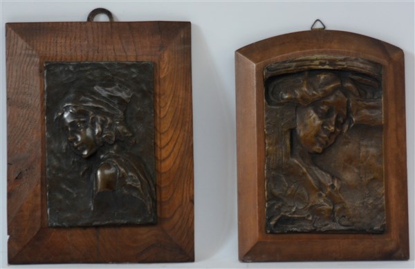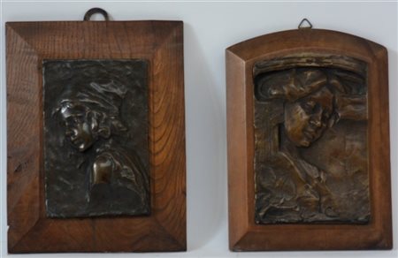 Due bassorilievi in bronzo siglati C.S., montati su pannelli in legno. Misure diverse
