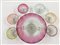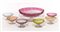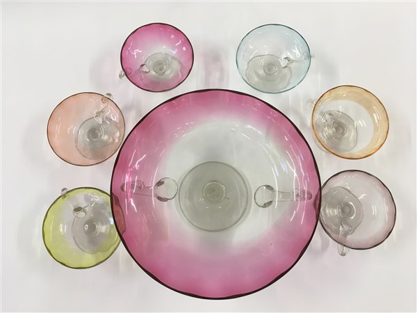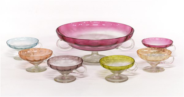 Servizio in vetro composto da una ciotola biansata e sei tazzine con manico, in vetro colorato. (lievi difetti)