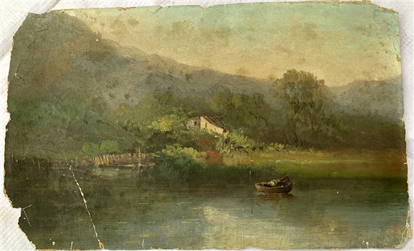 Ignoto del XIX Secolo "Veduta del Lago d'Iseo" olio su carta (cm 20x32) Titolato e datato al retro. (gravi difeti e mancanze)