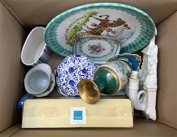 Cartone contenente numerosi oggetti in ceramica per usi e di fatture differenti