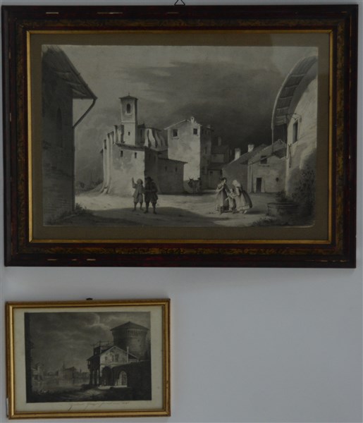 Giuseppe Gualandi "Scorcio di città" e "Paese con figure" lotto di due disegni m