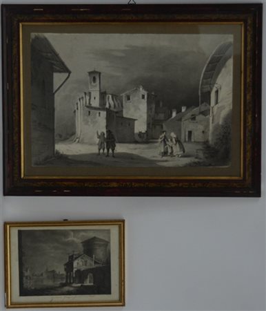 "Scorcio di città" e "Paese con figure" lotto di due disegni monocromi (misure diverse) Firmati e datati in basso. In cornici (difetti)
