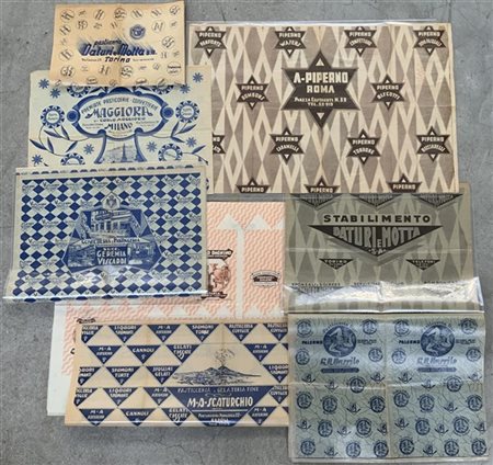 Gruppo di sette fogli pubblicitari da imballo per alimenti. Inizio sec. XX (dif