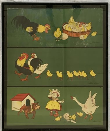 Lotto di tre illustrazioni litografiche per l'infanzia, firmati in basso a destra, in unica cornice