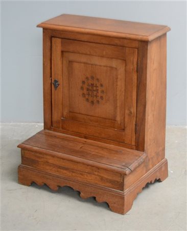 Antico inginocchiatoio ad un'anta intagliata a motivi religiosi, pianetto inferiore apribile, base sagomata (cm 65x78,5x44) (difetti)